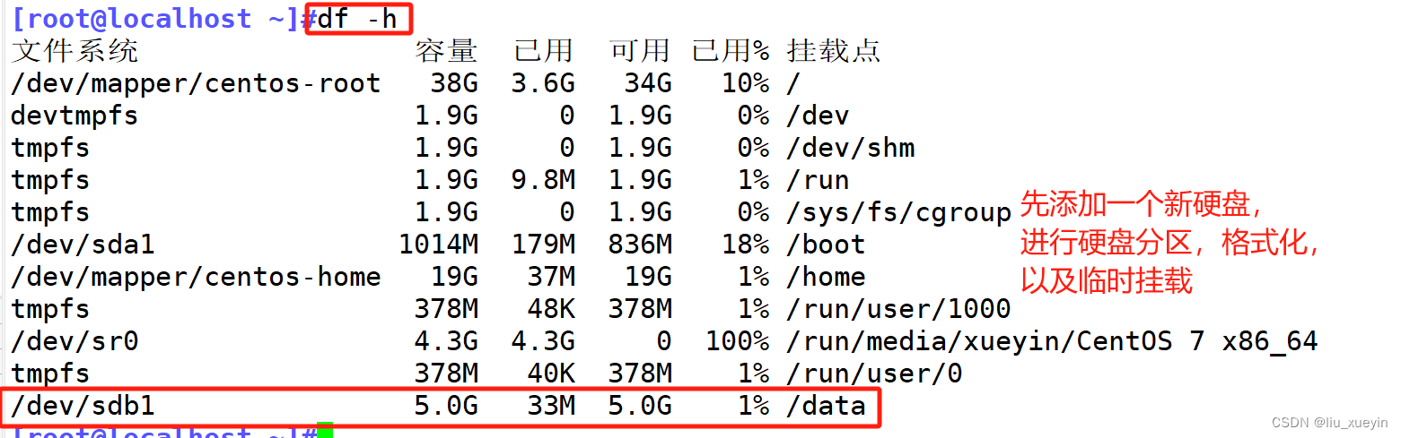 第一步:先添加一个新硬盘,进行硬盘分区,格式化,以及临时挂载;
