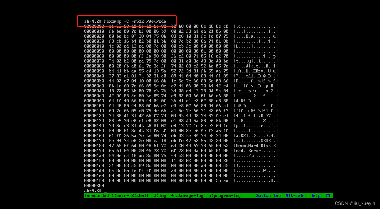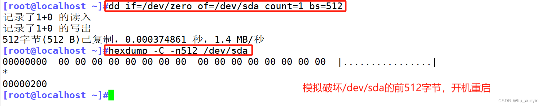 第二步:模拟破坏/dev/sda的前512字节,开机重启;
