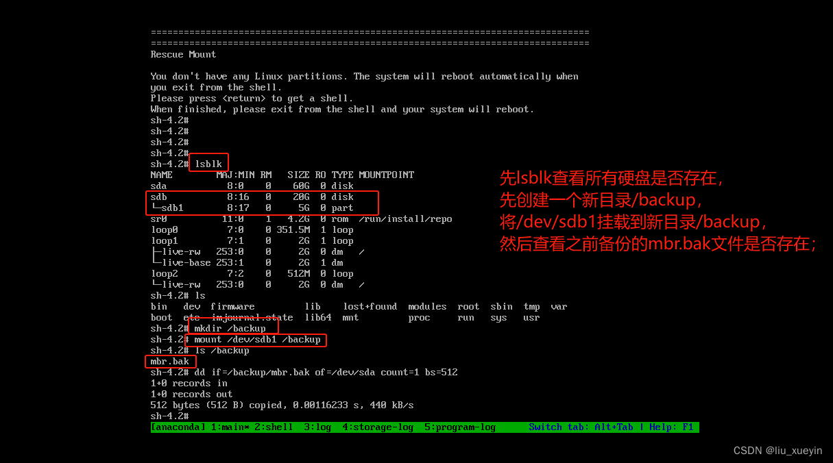 第五步:先lsblk查看所有硬盘是否存在,先创建一个新目录/backup,将/dev/sdb1挂载到新目录/backup,然后查看之前备份的mbr.bak文件是否存在;