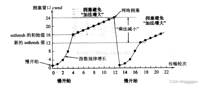 像上面这样的拥塞窗口增长速度,是指数级别的。"慢启动"只是指初使时慢,但是增长速度非常快。以便恢复传输速率。但是,为了到后面不增长的那么快,因此不能使拥塞窗口单纯的加倍。此处引入一个叫做慢启动的阈值。当拥塞窗口超过这个阈值的时候,不再按照指数方式增长, 而是按照线性方式增长(拥塞避免)。
