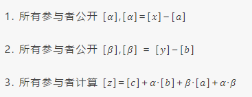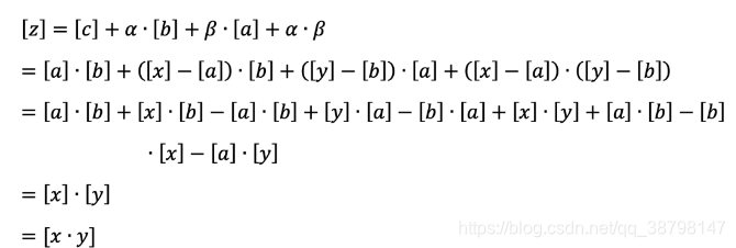 1.随机产生一个三元组:[a],[b],[c].其中a,b对所有参与者保密,c=a·b。假设秘密x和y已经被分享,现在需要计算[x,y].