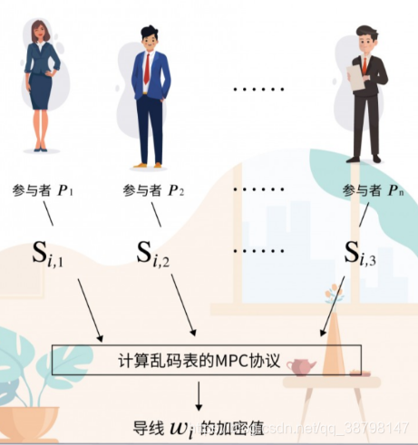 2对于布尔电路𝒞中的每一个门𝐺𝑖,所有参与者共同参与一个计算乱码表的多方安全计算协议
