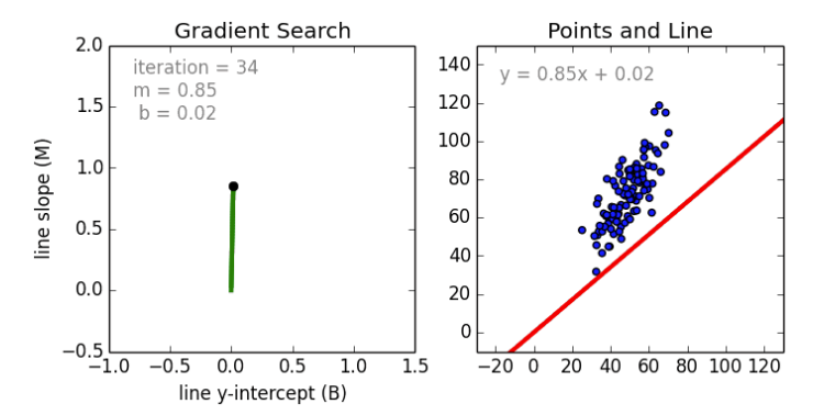 其中 a 为系数,x 是变量,b 为偏置。因为这个函数只有线性关系,所以只适用于建模线性可分数据。我们只是使用系数权重来加权每个特征变量的重要性。我们使用随机梯度下降(SGD)来确定这些权重 a 和偏置 b,过程如图所示: