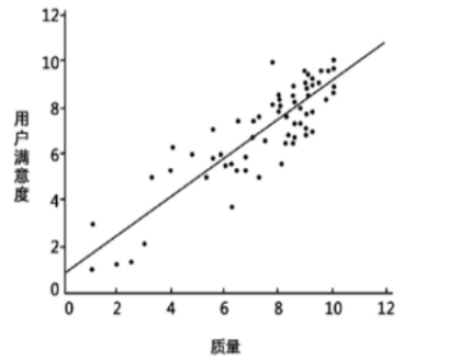如图是一个简单的回归模型,X 坐标是质量,Y 坐标是用户满意度,从图中可知,产品的质量越高其用户评价越好,这可以拟合一条直线来预测新产品的用户满意度