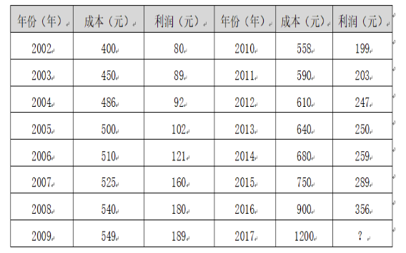 这里我们给出了斯坦福大学机器学习公开课线性回归的例子,假设存在表1的数据集,它是某企业的成本和利润数据集。数据集中 2002 年到 2016 年的数据集称为训练集,整个训练集共 15 个样本数据。重点是成本和利润两个变量,成本是输入变量或一个特征,利润是输出变量或目标变量,整个回归模型如下图所示: