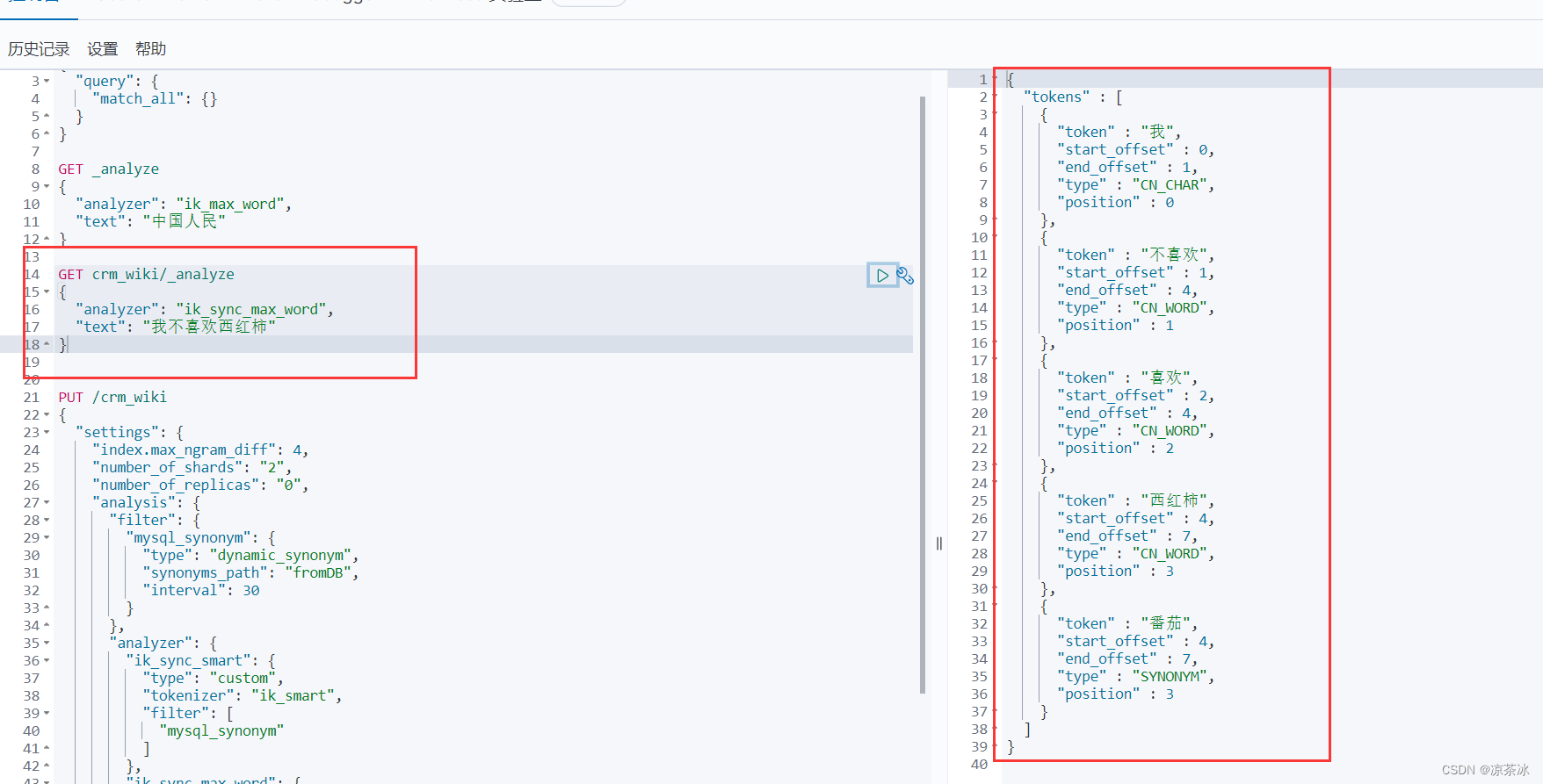 这个例子是创建了一个名为 crm_wiki 的索引。 然后在 settings 中创建了一个自定义过 滤器名为“mysql_synonym”,注意里面的 type、synonyms_path 的值是固定写法。Interval 是 词库定时刷新时间,单位是秒。默认设置的 30 秒,可以根据需要调整。