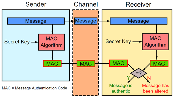 MAC 值通过允许验证者(也拥有密钥)检测消息内容的任何更改来保护消息的数据完整性及其真实性。