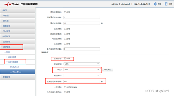 点击新建的连接池-高级属性,勾选连接验证,表名填dual,链接验证时间间隔填120。