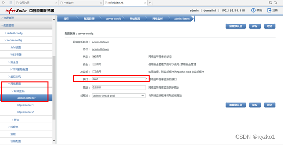 浏览器访问http://ip:8060管理工具地址,进入管理工具,点击配置管理-server-config-网络配置-网络监听-admin-listener,修改端口值,保存重启生效。