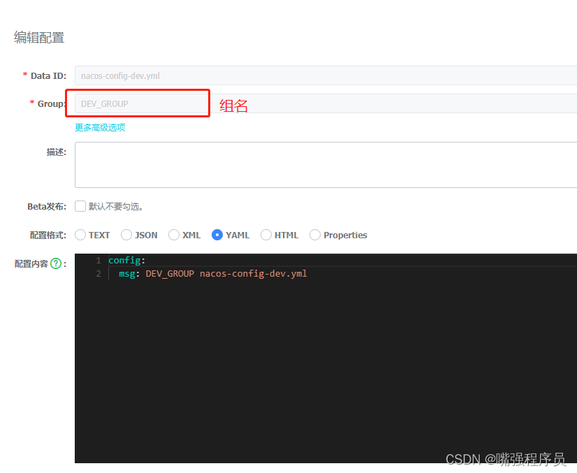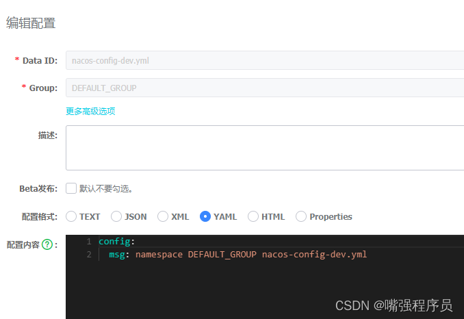 根据上面的规则,我们可以将dataId配置为: nacos-config-dev.yml , 此处需要和bootstrap.yml中配置的file-extension属性保持一致,否则不能正常读取。