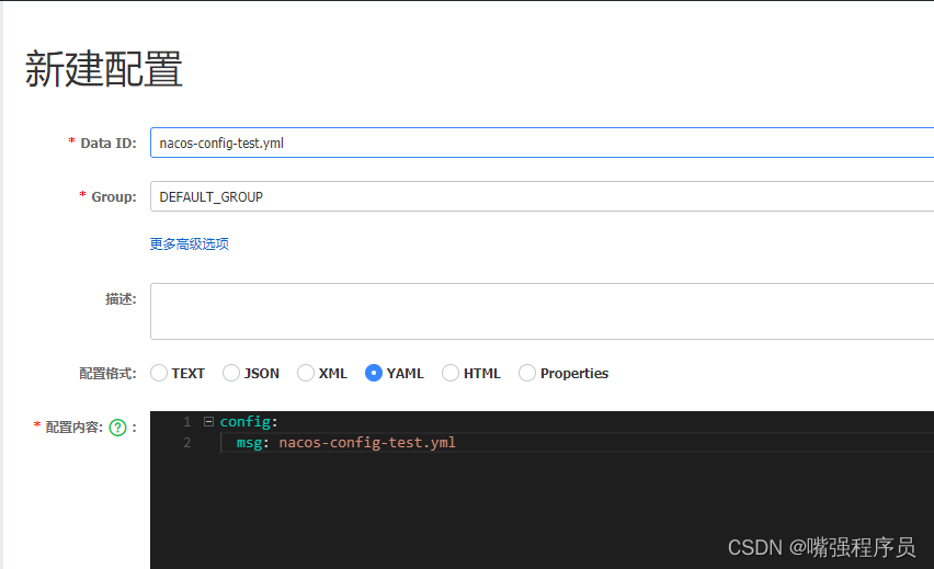 1)通过上面讲述的配置步骤,再配置一个配置文件,dataId:nacos-config-test.yml, test表示为测试环境。如图所示: