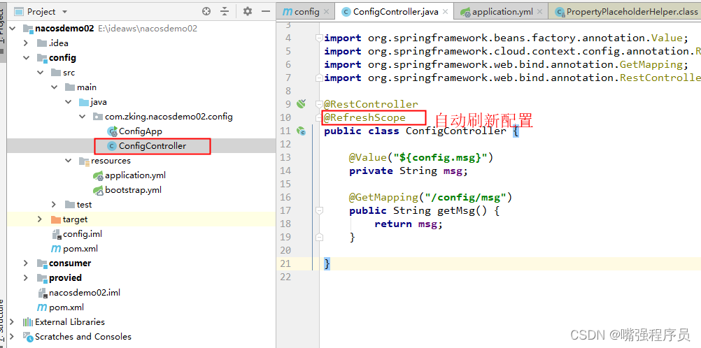 下面的开发示例演示了如何在一个服务中加入配置中心的支持。如果对Netflex公司开发的微服务组件有所了解,应该知道在Neflex服务组件中也有配置中心,但需要专门创建一个注册中心服务与GitHub(或类型的git仓库)中的配置文件仓库关联,其他服务使用配置中心时需要调用配置中心服务。nacos则比较简单,只用在需要配置中心的模块中直接配置即可。