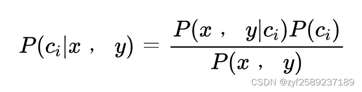 p(c2|x,y)。注意这邪恶概率与刚才给出的概率p(x,y|c1)不一样,不过可以使用贝叶斯准则来交换概率中条件与结果。应用贝叶斯准则得到: