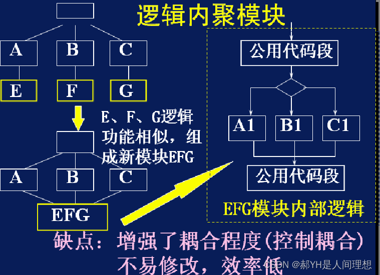 - 逻辑内聚:一模块完成功能在逻辑上属相同相似一类。