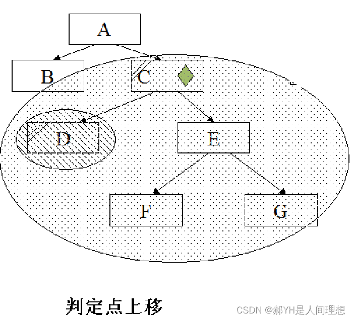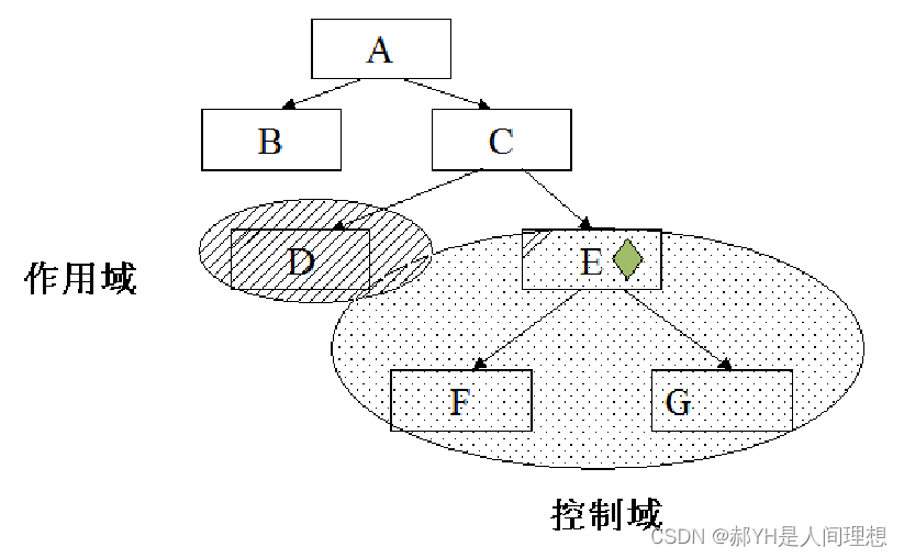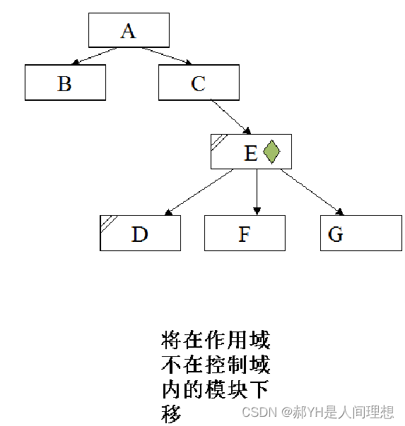 - 控制域:模块本身及所有直接或间接从属它的模块集合。若模块作用域不在控制域内,会增大模块间控制耦合。