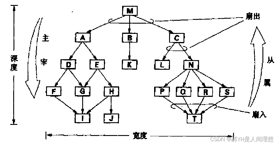 - 深度:软件结构控制层数,标志一系统大小和复杂程度。