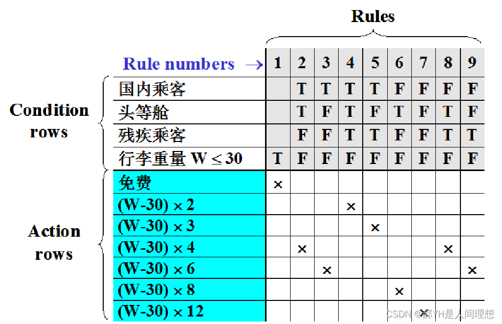 左上部列出所有条件; 左下部所有可能做的动作; 右上部表示各种条件组合的一矩阵; 右下部是和每种条件组合相对应的动作。