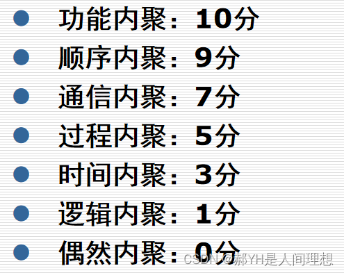 - 偶然内聚 :模块内各部分间没有联系,即使有也很松散。