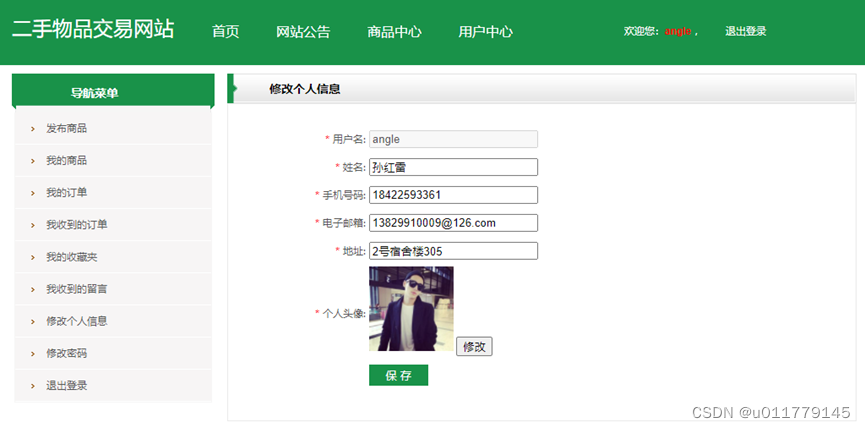 在用户中心,用户可以更新自己的个人档案资料,也可以发布手中闲置的二手物品,同时也可以查看自己的订单以及收藏夹、留言等信息,如图5-7和5-8所示。
