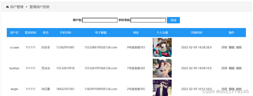 管理员可以查看在该网站上注册的用户信息,如图5-11所示,可以对其基本资料进行查看或者删除处理。