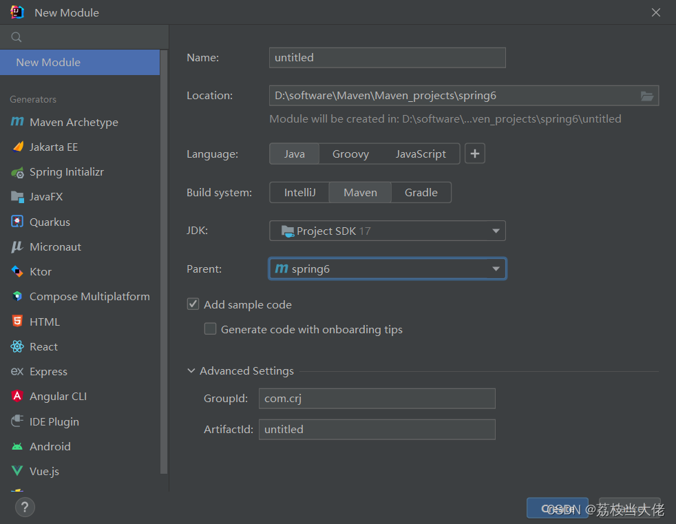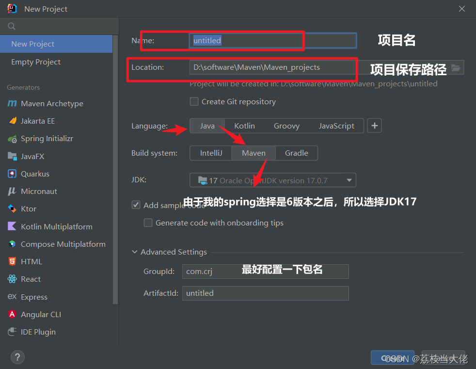 在配置那里选择是基于Maven创建的,这非常重要!同时需要配置项目名称和包名,按照自己项目的需求选择对应spring要求的Java JDK版本,这里荔枝选择的是JDK17,之后点击确定就创建好了。