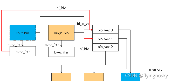 若将上述bio切分两部分,其中切出的部分split大小为bio_vec 0大小,这时会如下所示,其中蓝色为新分配的bio,并没有新分配bio_vec,只是通过bi_iter指示对应各自的数据: