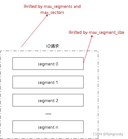 对于每个IO请求,受max_segments(最多包含的segment数目)和max_sectors(最多包含的扇区数目)限制。对于每个segment,受max_segment_size(每个segment最大的size)限制。