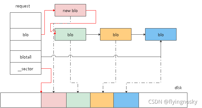 前向合并是当前bio在硬盘中的位置处于当前IO请求之前,这是会将该bio放置于bio链的最前面。如下图在上面的request基础上与new bio进行前向合并,合并后的结果如下所示: