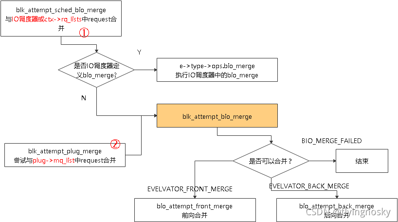下发过程中函数blk_attempt_sched_bio_merge()会根据IO调度器中是否定义bio_merge(),若定义了直接调用调度器中的bio_merge()回调处理。若没有定义,同样调用函数blk_attempt_bio_merge()进行合并。