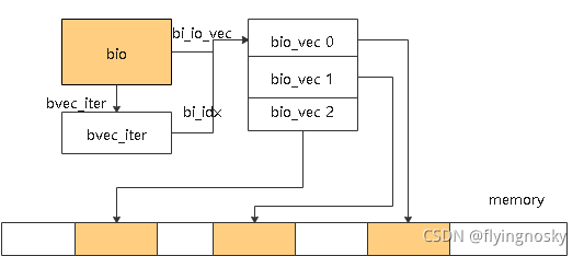 注意:这里bio_vec指向的是内存,因为這里是非连续的。bio对应的硬盘位置是连续的。