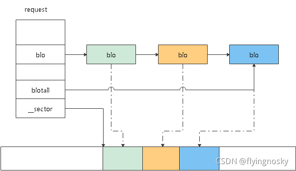 request中bio指向所连入的bio,biotail指向最后一个bio。request中成员__sector表示request中数据在硬盘中的起始位置。