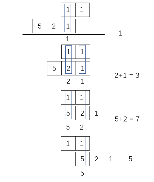 接着,下面的这一个多项式 5 + 2 x + x 2 5 + 2x + x^2 5+2x+x2从左到右滑过 x + 1 x+1 x+1,在滑动过程中, ( 5 + 2 x + x 2 ) (5 + 2x + x^2) (5+2x+x2)与 ( x + 1 ) (x+1) (x+1)重叠的地方,对应重叠的部分相乘,再相加。
