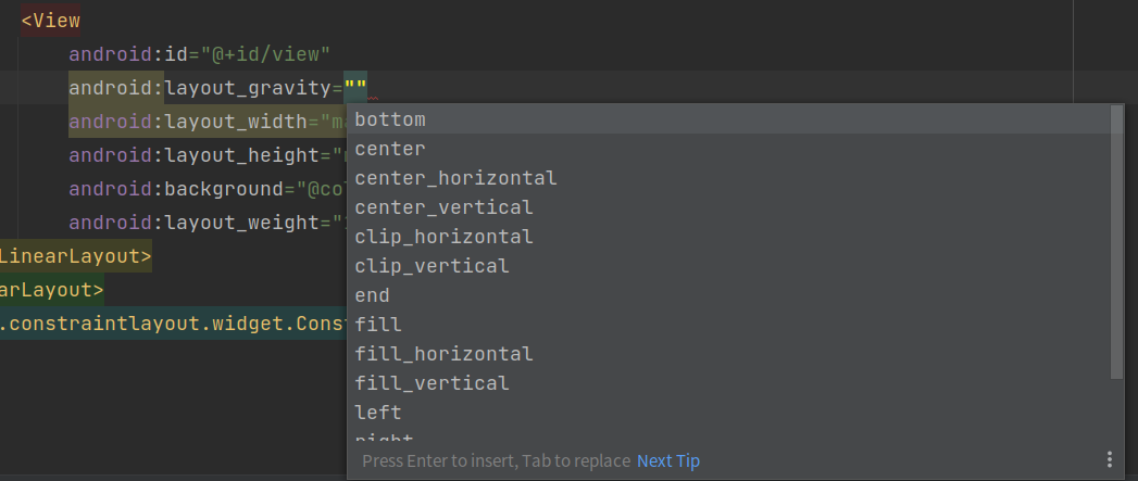 layout_gravity和gravity可以设置的值:top、bottom、left、right、center_vertical、fill_vertical、center_horizontal、fill_horizontal、center、fill、clip_vertical。(一个属性可以包含多个值,需用 “|” 分开),其具体作用如下:
