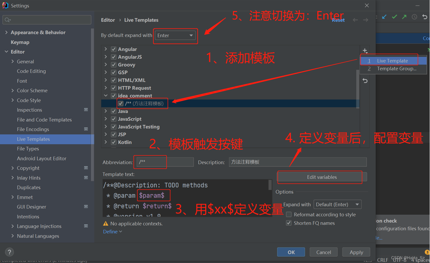 3、步骤【三-2】中,步骤5:切换为 Enter键,之前在Eclipse中开发,是这样触发注释模板的,可根据个人喜好进行自定义。