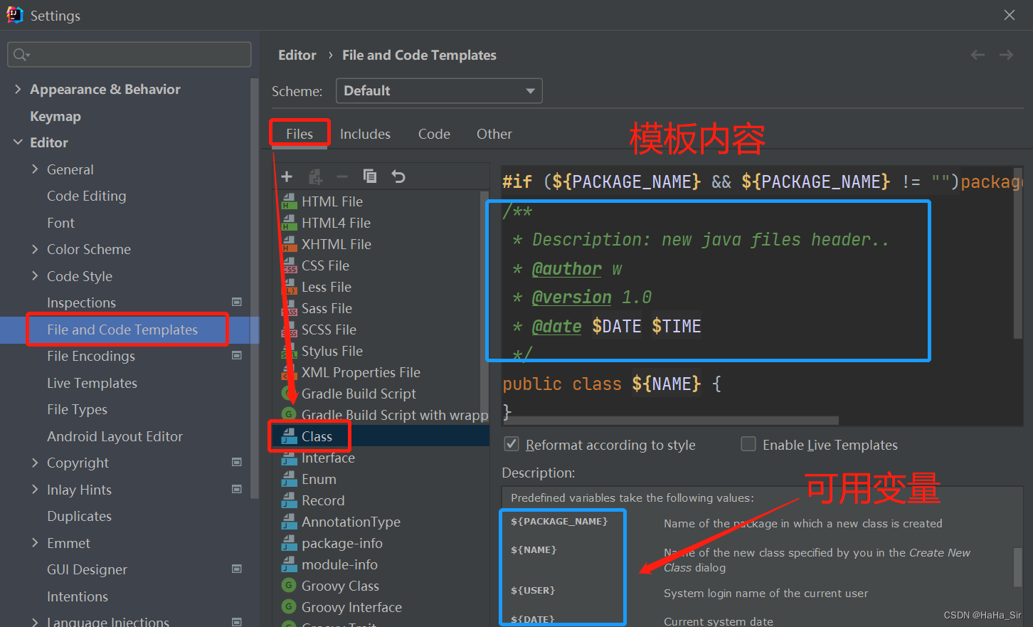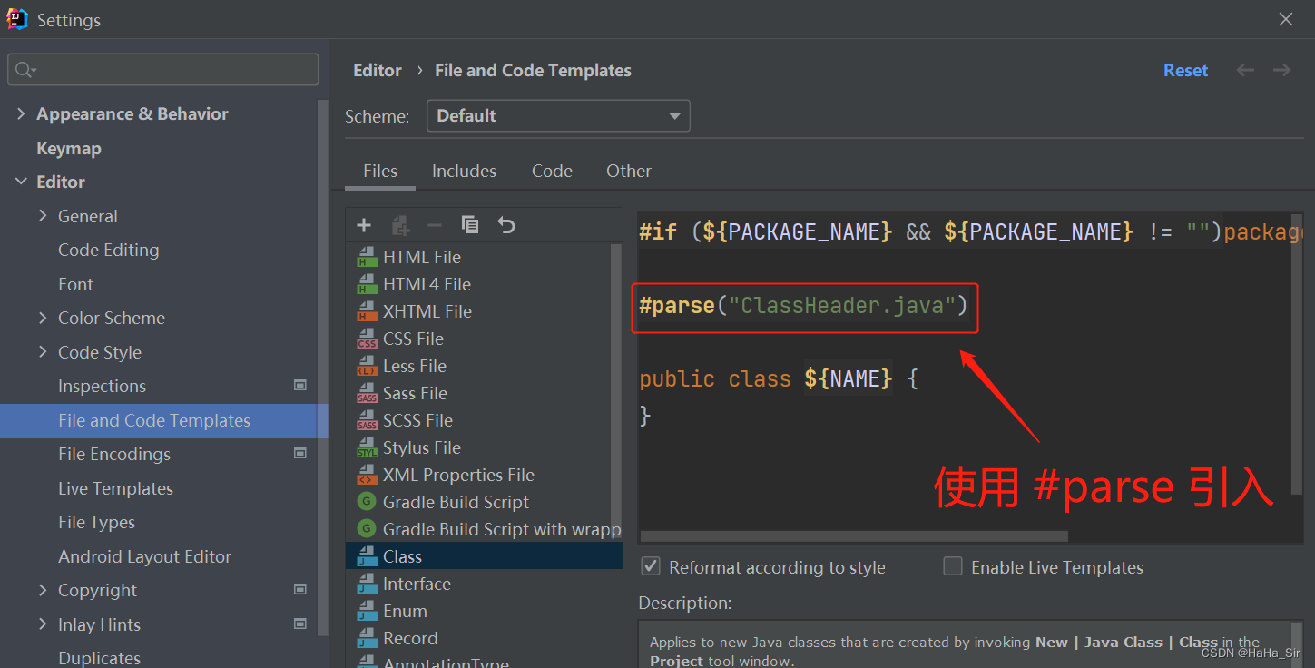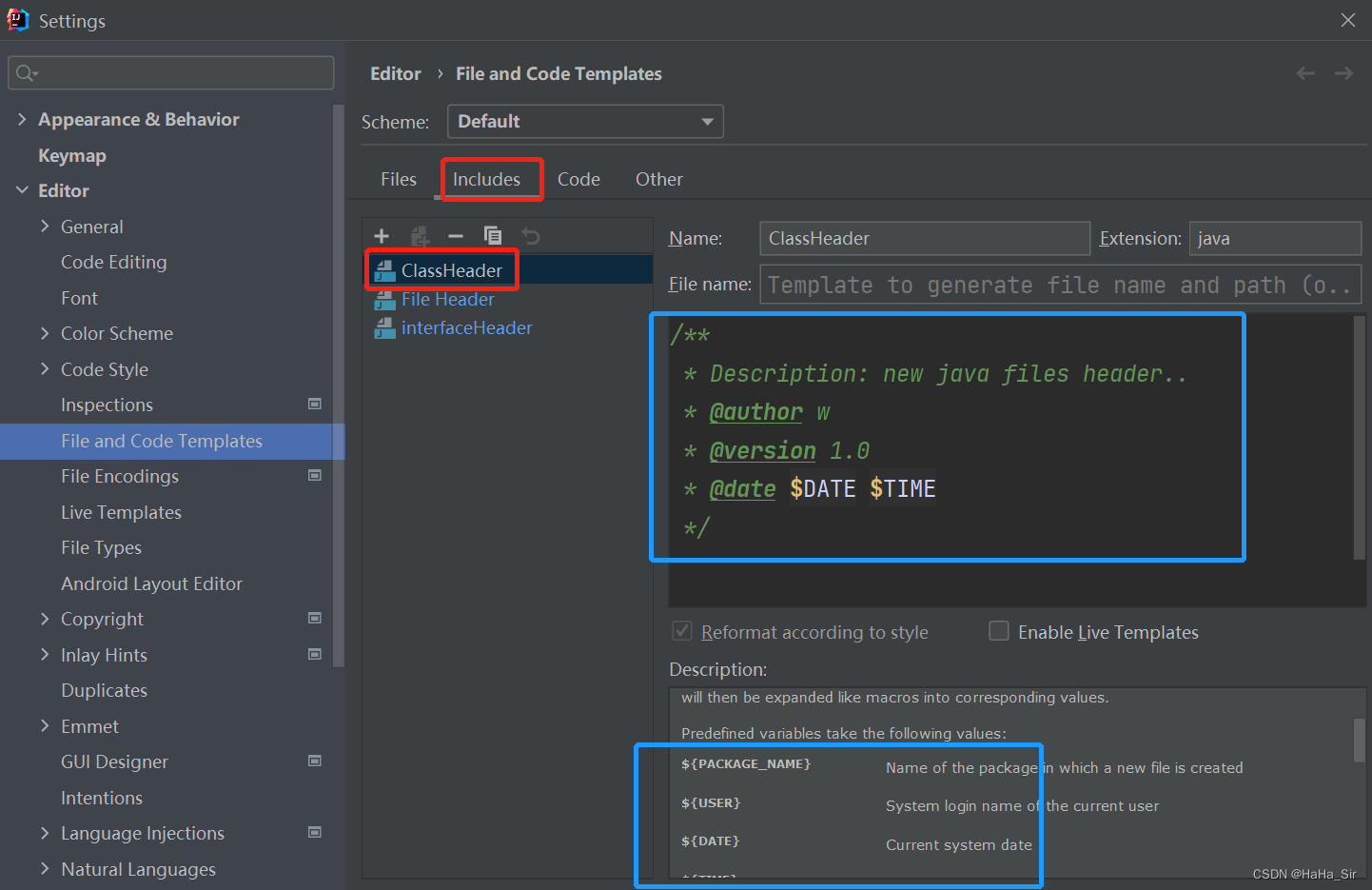2、新建java文件模板【方法二】--- 使用 include header:File --- Settings --- Editor --- File and Code Templates --- Includes --- 新建文件 "ClassHeader" --- 填入模板内容。