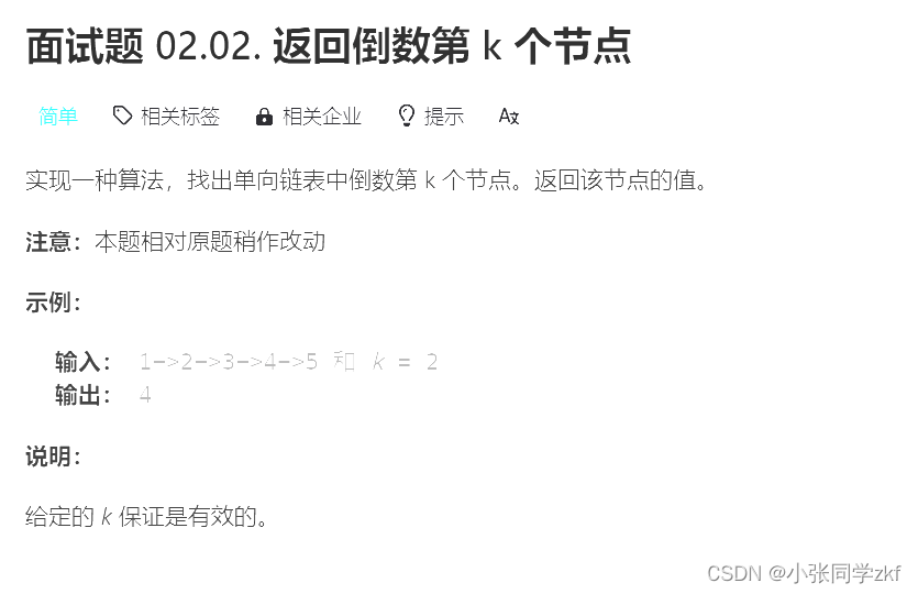 这道题跟我们上一篇博客有道题返回中间节点有点像,首先这道题时间复杂度O(1),所以我们遍历原链表只能遍历一次