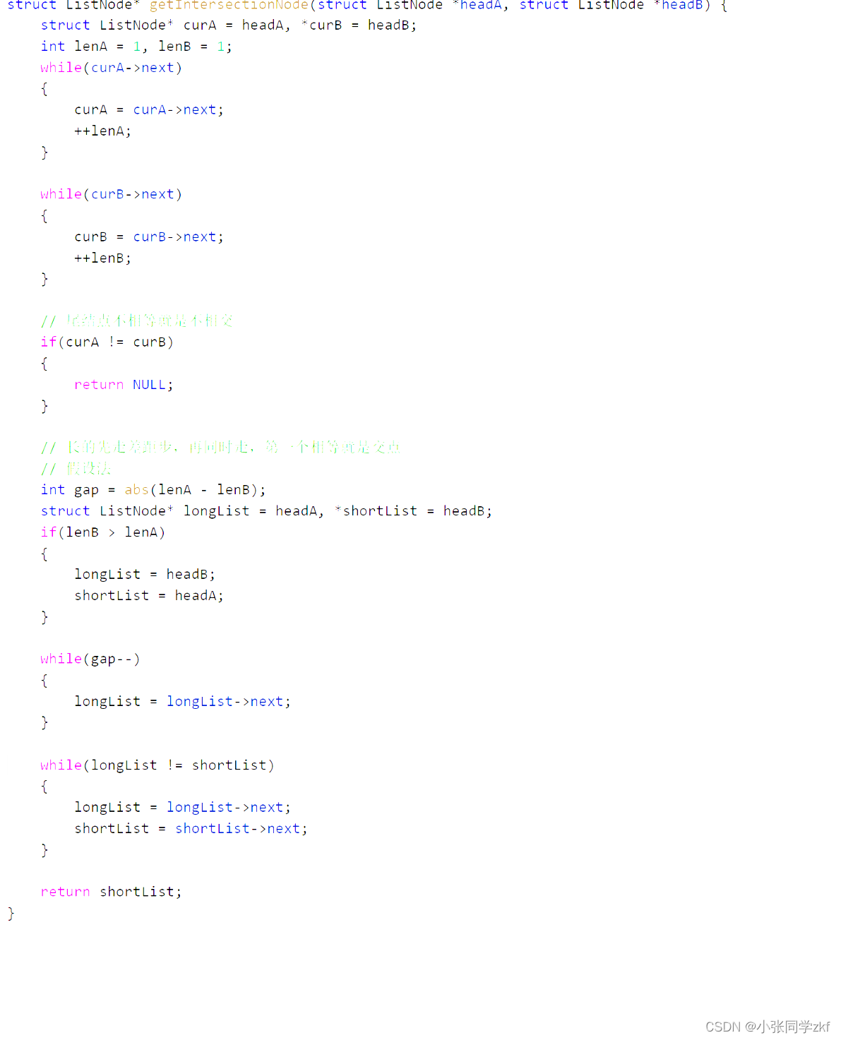 我们用俩指针指向两链表的头部,因为相交之前,俩链表的长度不确定,我们先判断,谁长,让谁先走他们相差的部分,走完另一个指针再遍历,此刻两个指针同时向后遍历,若遍历的值相同了,就找到第一个相交的节点了