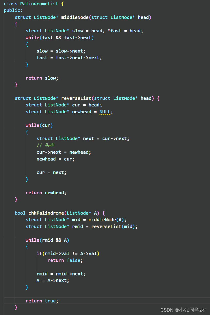 那这两个函数我就不详细说了,在我的博客链表专题1里有,一个是反转链表用三指针法,一个是返回中间节点用快慢指针法