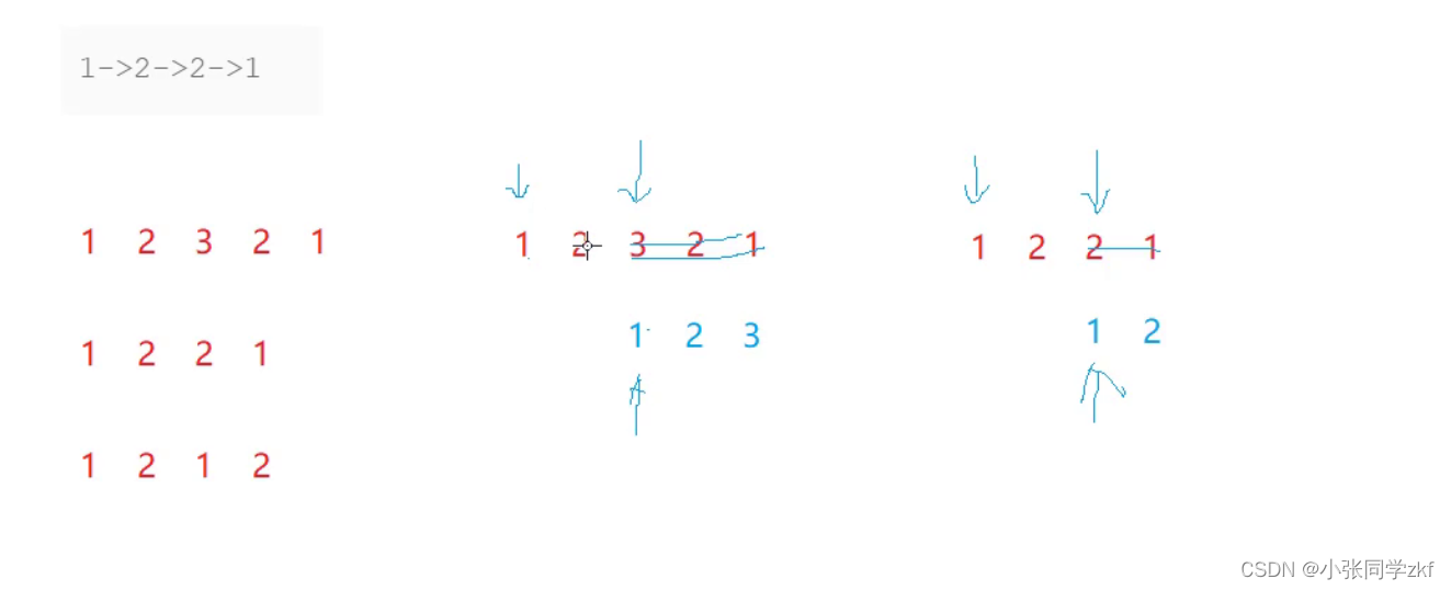 我们要想证明它是个回文结构,首先我们先了解回文结构的特征,就是以中间节点为中心,这个链表的值是对陈的,那我们要证明对称,我么是不是可以先找到终点节点,再反向一下以中间节点为首的之后的节点,然后中间指针与首指针遍历判断值是否相等,如图所示,这里有人有疑问,偶数个接点还可以看,但奇数个接点那,如图所示那个三,其实,再反转时,我们没有消除第一个二指向三的指针,所以两个2此刻都指向三, 只要在遍历时发生不相等的,那就不是回文,若直到遍历完,还都是相等的,那就是回文。