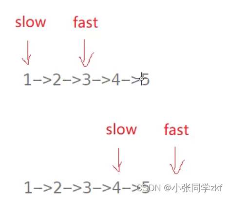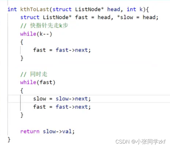 快慢指针,如若我让快指针先走k步,走完了再让慢指针走,此刻快慢指针就差k,双指针同时遍历,直到快指针走完,此刻慢指针返回的就是倒数第k的节点,所以一定要确保俩指针要差k