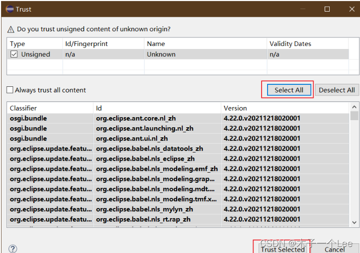 较新版本的Eclipse在53%时会弹出Trust界面,此处点击Select All,然后点击Trust Selected: