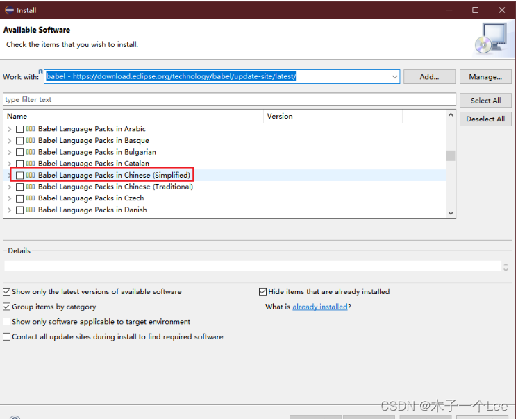 显示出来后找到Babel Language Packs in Chinese (Simplified)