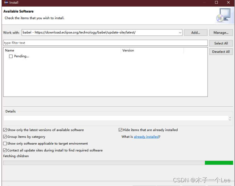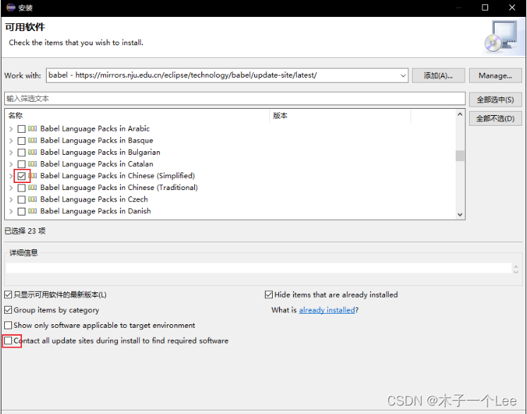 勾选上,同时记得取消勾选Contact all update sites during install to find required software,如果勾选此项程序会尝试连接官方的更新网站(国外的),导致安装变慢或直接卡住!,勾选好后点击Next。