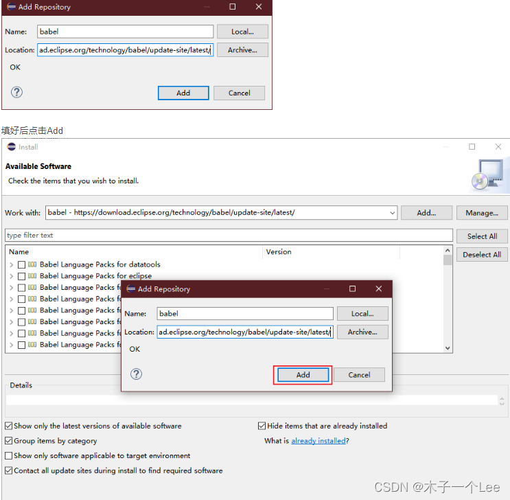 如果你使用的并非新版本的Eclipse(如果你使用的是最新版本的请忽略本部分),Location中所要填的地址需要根据你使用的版本来进行选择。