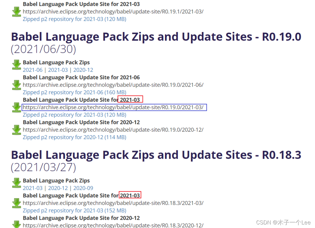 打开该页面,在列表中找到你使用的Eclipse版本,举个例子,比如你使用的是2021-03版本的eclipse,就在页面当中找到以你版本名称结尾的安装包: