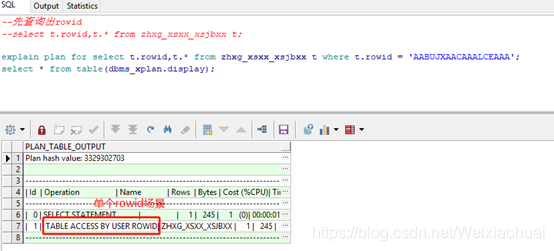 explain plan for select t.rowid,t.* from zhxg_xsxx_xsjbxx t where t.rowid = 'AABUJXAACAAALCEAAA';