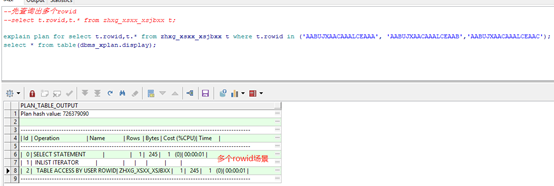 explain plan for select t.rowid,t.* from zhxg_xsxx_xsjbxx t where t.rowid in ('AABUJXAACAAALCEAAA', 'AABUJXAACAAALCEAAB','AABUJXAACAAALCEAAC');