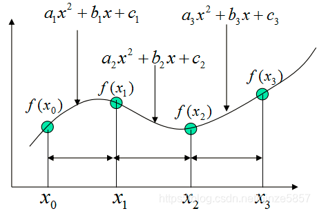 二次样条函数为:f(x) = a*x^2 + b*x + c