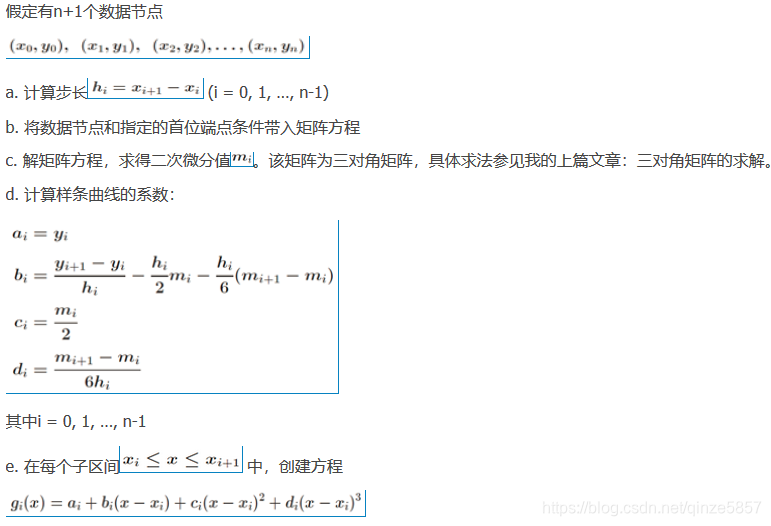简而言之,就是依然对每一个小区间进行插值(每一个区间都是一个三次多项式),但是我们不需要依赖于导数的已知;由于我们要做的就是使得端点出满足某种条件的光滑(一般来说,三次样条插值就是要满足二阶导数连续),根据这个要求,我们就可以在未知导数的情况下推导出样条函数。具体方法看下面