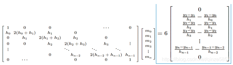对于三次样条函数4*4=16个参数,也就是找出16个方程就解决了问题,除与上面相同外,中间的二阶导相等,3个方程,假设第一个方程的二阶导数为0,即a1=0,b1=0,2个方程,一共16个方程。